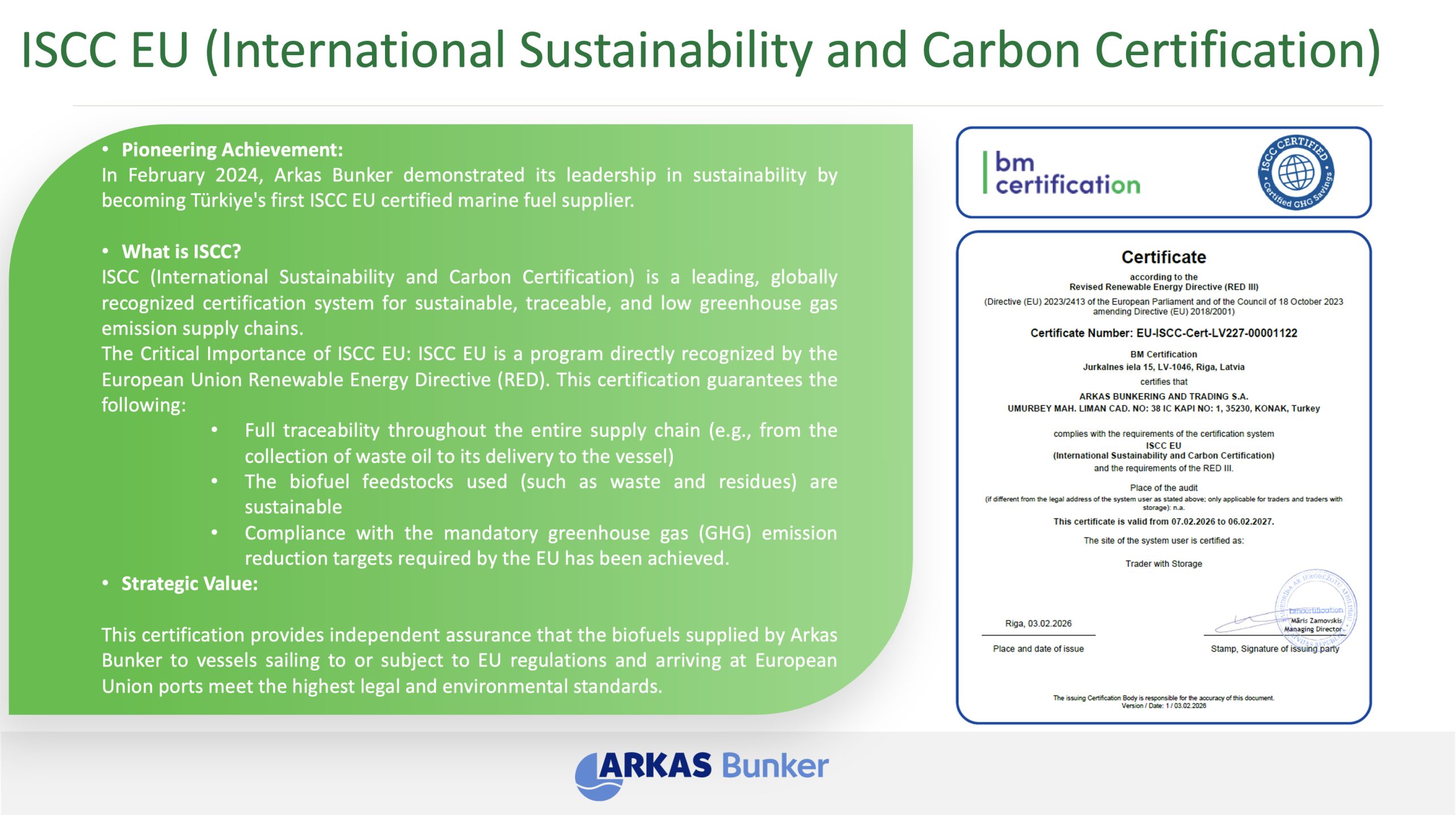 Arkas Bunker, proud to be the first company in Türkiye’s maritime fuel sector to receive ISCC EU certification, continues to support companies in reducing their carbon emissions through its sustainable business model in maritime fuels.